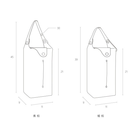• 尺寸大小:長 45(長扣) / 39 (短扣) x 寬 11 x 高 9 公分,掛帶全長30公分